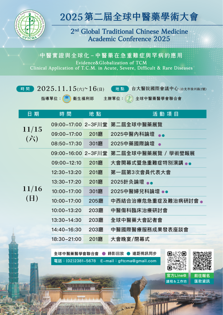 本屆大會除了有內科、婦兒科、針灸三大論壇,及中醫傷科研討會。並首次與台灣中藥商公會全國聯合會舉辦「中藥國際論壇」,大會邀請產官學研多方代表,共同探討中藥產業的永續發展與國際規範,展現台灣中藥產業鏈的實力與潛能。